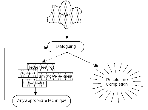We start out with a more or less vague subject, or maybe just with the inkling that there is something there that ought to be worked on. It might simply be that the client came to see you, and now she is sitting in the chair in front of you and neither you nor she knows exactly what it would be best to work on. Dialoguing is what you do to find out. Maybe the client gives a general subject of concern, like "Work", but we don't know exactly what it is about "work" that ought to be changed. We enter into a dialogue to find out what we are really talking about.
